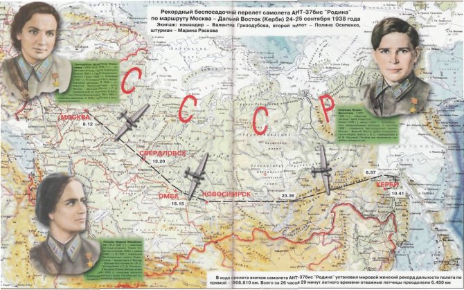 24 сентября 1938 года начался беспосадочный перелет советских летчиц В.С. Гризодубовой, П.Д. Осипенко, М.М. Расковой по маршруту Москва – Дальний Восток. Перелет длился 26 ч. 29 мин. Самолет ЛНТ-37 бис «Родина» преодолел почти 6 тыс. км. 11.02.1938 г. участницам перелета были присвоены звания Героя Советского Союза.