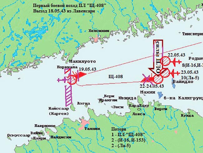 Не дождавшись от «Щ-303» радиограммы о форсировании второй минно-артиллерийской позиции, командование приказало Кузьмину выйти в море. В ночь на 19 мая 1943 года ПЛ «Щ-408» под командованием капитан-лейтенанта П.С.Кузьмина вышла с рейда острова Лавенсари на позицию в Балтийское море. До точки погружения на восточном Готландском плесе ее сопровождали пять сторожевых катеров «морских охотников» и семь катеров-тральщиков. Далее лодка продолжала движение самостоятельно и благополучно форсировала готландский противолодочный рубеж. Через три дня подводники доложили, что лодка получила незначительное повреждение, ввиду того что противник не дает возможности зарядить аккумуляторную батарею. В штабе флота приняли срочные меры – выслали штурмовики и истребители к месту нахождения «Щ-408». Внезапным ударом они рассеяли скопление вражеских кораблей, один сторожевик и два катера противолодочной обороны гитлеровцев потопили. Немцы направили в этот район свою истребительную авиацию. В небе завязались жаркие воздушные бои. Наши летчики потеряли четыре истребителя, два Ла-5 и по одному И-16 и И-153.