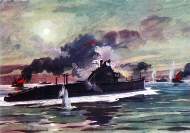 Подводная лодка Щ-408 ведёт неравный бой с пятью боевыми катерами противника. Картина художника И.Родионова